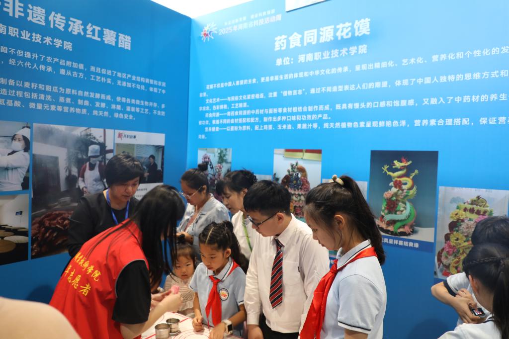 近日,2025年河南省科技活动周启动仪式在郑州科技馆举行。河南职院四项科技成果“耘上小飞匠——多场景无人机VR智能‘速’练舱”“新能源汽车电控系统故障诊断实训教学平台”“醋里乾坤——非遗传承红薯醋”“药食同源花馍”参加主场展览活动,向社会各界集中展示了学校在科教融汇、产教融合、文化传承与科学普及方面的最新探索与显著成果。