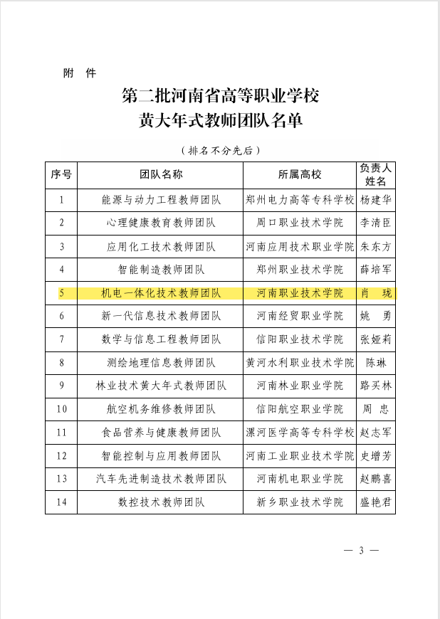 2021年8月,学校机电一体化技术专业获批“河南省高校黄大年式教师团队”。